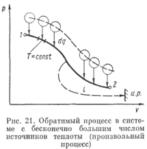 Выводы, полученные из рассмотрения последнего примера, позволяют любой произвольный процесс рассматривать как обратимый. Для этого нужно только представить, что этот процесс протекает в системе с бесконечно большим числом источников теплоты, имеющих соответствующие температуры.