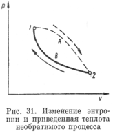 Рассмотрим два состояния рабочего тела, соответствующие токам 1 и 2 (рис. 31). В силу указанных свойств энтропии как функции состояния очевидно, что для любого процесса, обратимого или необратимого, протекающего между этими состояниями, изменение энтропии s = s2 — s1 будет одно и то же1.