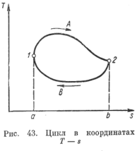 Круговые_процессы или циклы в координатах Т—s, так же как и в любой другой системе координат, где по осям отложены параметры состояния, представляются замкнутыми линиями. Так как в таких процессах изменение внутренней энергии тела u = 0, то работа за цикл определяется как алгебраическая сумма подводимой и отводимой теплоты: