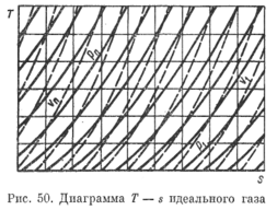 Такой диаграммой удобно пользоваться при исследовании процессов и циклов, протекающих в рабочих телах, которые можно принимать за идеальные газы. Это допустимо, например, при исследовании рабочего процесса воздушных и некоторых газовых компрессоров, двигателей внутреннего сгорания, газотурбинных установок и т. п. В качестве примера в приложении дана диаграмма Т—s для воздуха, который принимается за идеальный газ.