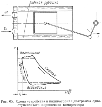 На рис. 65 приведена схема устройства простейшего поршневого одноступенчатого компрессора. На этом рисунке дана его индикаторная диаграмма, т. е. диаграмма, устанавливающая зависимость давления р н / м2 в цилиндре от хода пм поршня, или,
