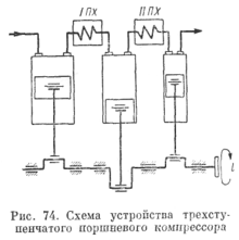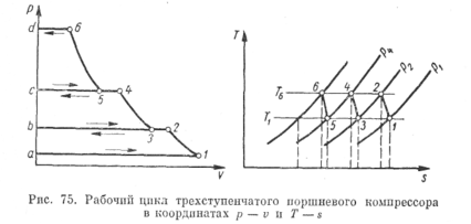 Для получения высоких давлений (порядка 100 am и выше) применяют многоступенчатое сжатие (до пяти и выше ступеней). Устройство таких компрессоров и принцип их работы подобны разобранным для двухступенчатого. На рис. 74 приведена схема трехступенчатого компрессора с двумя промежуточными холодильниками, а на рис. 75 — диаграмма его рабочего процесса в координатах р — v и Т — s.