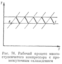 На рис. 76 приведен рабочий процесс многоступенчатого компрессора с промежуточным охлаждением. Очевидно, что сжатие в таком компрессоре в значительной мере приближается к изотермическому. Можно представить, что в пределе, при числе ступеней, равном бесконечности, сжатие протекало бы по изотерме 1А, т. е. потребовало бы минимальной затраты работы. Однако все сказанное об оценке общей экономичности двухступенчатого компрессора с учетом затрат на промежуточное охлаждение остается справедливым и в этом случае.