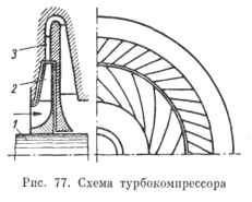 На рис. 77 представлена схема устройства одного из типов центробежных турбокомпрессоров.