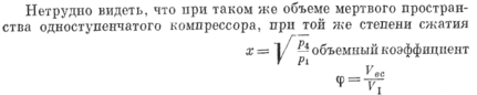 В результате анализа рабочих Процессов компрессоров можно установить, что на объемный коэффициент оказывают влияние величина объема мертвого пространства и степень сжатия, т. е. отношение конечного давления (нагнетания) к начальному (всасыванию). При увеличении объема мертвого пространства объемный коэффициент падает. Он падает также и при росте степени сжатия. Последний фактор оказывает решающее влияние, поэтому сжатие газа в одном цилиндре ограничивается некоторыми значениями этого отношения.
