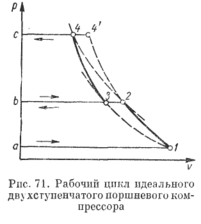 На рис. 73 приведен рабочий цикл двухступенчатого компрессора, отличающегося от идеального только наличием объема мертвого пространства.