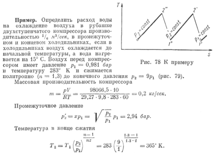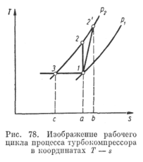 Процесс сжатия газа в турбокомпрессоре в идеальном случае можно считать адиабатным. Нагляднее всего этот процесс изображается в координатах Т — s (рис. 78). Идеальное адиабатное сжатие происходит по адиабате 1—2. Но так как в турбокомпрессоре сжатие протекает весьма быстро и сопровождается трением газа о стенки каналов и диски, то в результате температура сжатого газа T2' несколько выше температуры конца адиабатного сжатия Т2. Этим обусловливается и то, что работа, затрачиваемая на привод реального турбокомпрессора, всегда больше работы, необходимой для обратимого адиабатного сжатия. Учитывая все это,