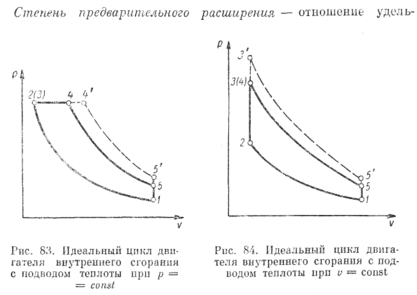 Рассмотрение отдельных процессов, характеризующих работу двигателя внутреннего сгорания, обычно начинают, предполагая идеальные условия работы всех его органов. Эти условия подразумевают отсутствие гидравлических сопротивлений впускного и выпускного клапанов, полное сгорание топлива при любом желаемом характере, изменения давления рабочего тела в цилиндре и процессе сгорания и адиабатное протекание процессов сжатия и расширения. При таких идеальных (теоретических) условиях рабочий цикл двигателя будет характеризоваться теоретической индикаторной диаграммой (сплошная линия на рис. 80).