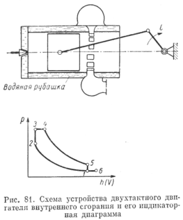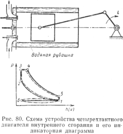 На рис. 80 показаны схема устройства двигателя и его индикаторная диаграмма, т. е. графическое изображение зависимости давления в цилиндре р н/м2 от хода поршня hM или от объема цилиндра V м3. Различают теоретическую и действительную индикаторные диаграммы. Индикаторной диаграммой весьма наглядно представляется рабочий цикл двигателя, т. е. некоторое вполне закономерное чередование различных процессов, протекающих в рабочем объеме его цилиндра за один или два оборота вала. При этом следует иметь в виду, что в число процессов, составляющих рабочий цикл реального двигателя, входят процессы, в течение которых количество рабочего тела меняется (впуск и выпуск), а также процессы изменения химического состава вещества (горение). Поэтому рабочий цикл двигателя не следует смешивать с термодинамическим циклом, характеризуемым постоянным количеством вещества не изменяющегося химического состава.