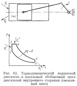 Поэтому в термодинамике рабочие циклы реальных двигателей заменяют соответствующими идеальными термодинамическими циклами двигателя, предполагая, что при осуществлении цикла химический состав рабочего тела не меняется. В таком цикле процессы сгорания топлива и выпуска продуктов сгорания заменяют соответственно процессами подвода и отвода теплоты. Само собой разумеется, что идеальный термодинамический цикл не может быть осуществлен в реальном двигателе, даже если представить теоретические условия его работы. Идеальный термодинамический цикл можно осуществить в двигателе, если из крышки цилиндра удалить клапаны, между крышкой и поршнем поместить 1 кг рабочего тела, а процессы сгорания топлива и выпуска заменить соответственно процессами подвода и отвода теплоты (рис. 82). Идеальный термодинамический цикл должен в точности соответствовать теоретическому рабочему циклу, т. е. оба цикла должны представляться в координатах р — v совпадающими фигурами, а подводимая в идеальном цикле теплота должна равняться теплоте, выделяемой при полном сгорании топлива.