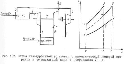 Применение в цикле ступенчатого подвода теплоты (ГТУ с несколькими камерами сгорания). Экономичность установки можно увеличить применением промежуточных камер сгорания. В этом случае рабочее тело после расширения в группе ступеней турбины направляется в промежуточную камеру, куда подается также и топливо. Такая же промежуточная камера может быть и после второй группы ступени турбины, и после третьей. На рис. 102 показана схема установки с одной промежуточной камерой сгорания ПKС. Так как в камеры сгорания установки воздух, необходимый для горения топлива, подается с большим избытком (трех- и пятикратное количество по отношению к теоретически необходимому), то горение топлива оказывается возможным не только в главной камере сгорания, но и в промежуточных.