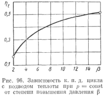 Как следует из уравнений (223) и (224), термический к. п. д. цикла зависит только от степени повышения давления или степени сжатия . На рис. 96 показана зависимость t от .
