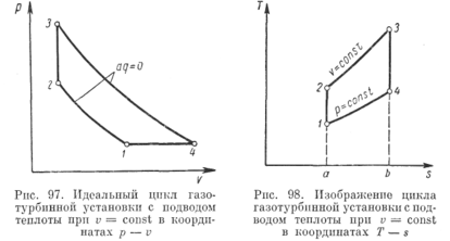 Цикл с подводом теплоты при v = const. Этот цикл представлен в координатах р — v на рис. 97 и в координатах Т — s на рис. 98. Подводимая теплота представлена площадью а23Ъ и вычисляется по уравнению