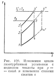 Увеличение степени сжатия или степени повышения давления. Из уравнений (223) и (224), а также графиков, приведенных на рис. 96 и 99, следует, что термический к. п д. идеального цикла установки с подводом теплоты при р=const резко возрастает при увеличении степени повышения давления (степени сжатия). Поэтому выгодно работать при больших степенях сжатия. Однако при этом в установках, работающих с выпуском в атмосферу (начальные параметры сжатия постоянны и не могут быть изменены), повышается и температура рабочего тела (T3' > Т3) (рис. 100). Современные материалы, которыми располагает газотурбостроепие, не позволяют работать с газом, имеющим температуру выше 650—700° С (редко, для турбин, с температурой 800° С и выше). При больших температурах газа металл лопаток теряет свою прочность. Такие значения максимальных температур определяют для турбин, работающих с выпуском в атмосферу, максимальную степень повышения давления, равную 6—8. Дальнейшее повышение этой величины или, что то же самое, степени сжатия требует применения новых, более жаропрочных материалов или организации охлаждения лопаток. Эти две проблемы являются главнейшими в современном турбостроении.