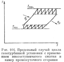 Нетрудно видеть, что в пределе при бесконечно большом числе ступеней сжатия и бесконечно большом числе промежуточных ступеней подвода теплоты цикл такой ГТУ превращается в цикл, который по своей экономичности тождествен обобщенному (регенеративному) циклу Карно.