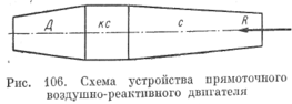При рассмотрении схемы работы воздушно-реактивного двигателя было сказано, что сжатие воздуха по адиабате 1—2 (рис. 105) происходит как в диффузоре, так и в компрессоре. Однако можно представить себе следующий предельный случай: все сжатие от давления р1 до р2 происходит только в диффузоре. Компрессор, а с ним и турбина отсутствуют. В этом случае мы получаем так называемый прямоточный воздушно - реактивный двигатель. Схема такого двигателя показана на рис. 106. Эти двигатели