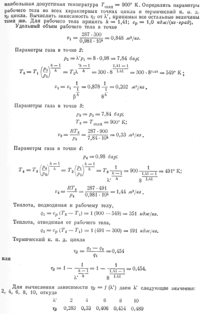 Определить параметры рабочего тела во всех характерных точках цикла и термический к.п.д. t цикла, если степень повышения давления ’=6, а максимально допустимая в цикле температура Тмах=1100К. Для рабочего тела принять ср=1 кдж/(кг*град); сv=0,711 кдж/(кг*град); k=1,41.