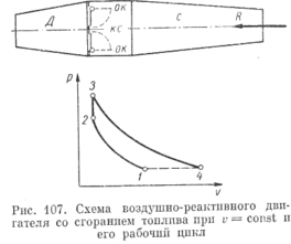 Рассмотренные выше системы воздушно-реактивных двигателей отличались тем, что в их камерах сгорания давление не менялось. Последнее обеспечивается соответствующей организацией непрерывной подачи в нее воздуха и топлива. Однако такие двигатели могут работать и при сгорании топлива при постоянном объеме. Для этого воздух и топливо в камеру сгорания следует подавать периодически. На рис. 107 показана схема прямоточного воздушно-реактивного двигателя со сгоранием топлива при v = const. Воздух, поступая в диффузор Д, сжимается (адиабатный процесс 1—2) и силой своего давления открывает обратные клапаны OR, установленные в перегородке, разделяющей диффузор и камеру сгорания. При этом воздух вытесняет из диффузора и камеры сгорания большую часть газов — продуктов сгорания, оставшихся от предыдущего цикла. Одновременно с воздухом в камеру сгорания подается и топливо. Образовавшаяся горючая смесь нагревается от стенок камеры сгорания и оставшихся от предыдущего цикла горячих газов и воспламеняется. В результате в камере сго-