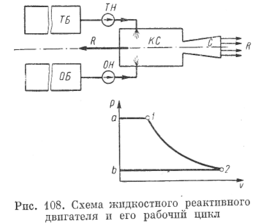 Схема устройства жидкостного реактивного двигателя показана на рис. 108. Из топливного бака ТБ и бака окислителя 0В топливо и окислитель подаются специальными насосами ТН (топливный насос) и ОН (насос окислителя) в камеру сгорания КС, где