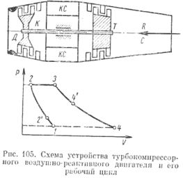На рис. 105 показана схема такой системы, являющейся одним из основных двигателей современной авиации. Воздух из атмосферы входит в диффузор Д, из которого поступает в компрессор К. После сжатия "в диффузоре и компрессоре, которое теоретически протекает соответственно по адиабатам 1—2' и 2'—2, воздух идет в камеры сгорания КС, куда под давлением через форсунку впрыскивается раскаленное топливо.