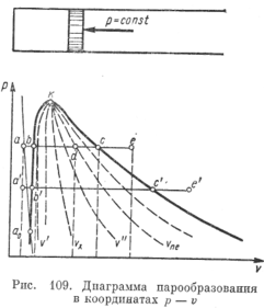 Рассмотрим процесс получения водяного пара из воды в координатах р — v. Пусть состоянию 1 кг воды при температуре 0° С, некотором давлении р и удельном объеме vо соответствует в координатах р — v точка а (рис. 109).