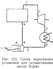 Цикл Карно мог бы быть реально осуществлен в ПСУ, работающей на влажном паре, так, как показано на рис. 121. Возможность осуществления такого цикла Карно основывается на том, что в области влажного пара изотермические процессы совпадают с изобарными и могут быть реально проведены в котле и конденсаторе. В физическую схему установки (рис. 122 сравни с рис. 117) необходимо ввести следующие изменения: питательный насос заменяется компрессором К, в котором адиабатно сжимается влажный пар (процесс 3—4); в конденсаторе не должна производиться полная конденсация пара.