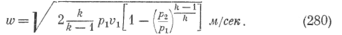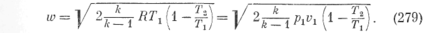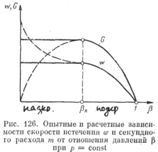 Однако опыт показывает, что для надкритической области значения расхода и скорости, вычисленные по уравнениям (284) и (280), несправедливы. Опытом установлено, что в этой области расход, и скорость остаются постоянными и равными значениям этих величин при рк. Таким образом, в надкритической области графики т = f() и = () представляются прямыми, параллельными оси абсцисс.