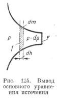 Из потока выделим бесконечно малый элемент массы вещества dm, сделаем это с помощью двух параллельных плоскостей f, расположенных бесконечно близко одна от другой на расстоянии dh (рис. 124). Разность этих площадей — бесконечно малая величина высшего порядка и потому не учитывается. На сечение, располагаемое дальше от устья сопла, действует давление р, а на сечение, которое ближе к устью, — давление р — dp.