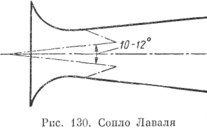 Сопло, обеспечивающее такие условия истечения, было предложено и выполнено впервые шведским инженером Лавалем и получило поэтому название сопла Л аваля. Оно отличается от рассмотренного выше суживающегося сопла тем, что суживающаяся часть дополняется конической расширяющейся с углом конусности 10—12° (рис. 130). Процессы, протекающие в этом сопле, состоят в следующем: в суживающейся части паро-газо-