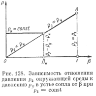 Сказанное наглядно иллюстрируется графиками изменений давлений в окружающей среде р2 и в устье ру в зависимости от изменений (рис. 128). Между р2 и при р1 = const зависимость представляется прямой ОА, так как согласно принятому выше обозначению