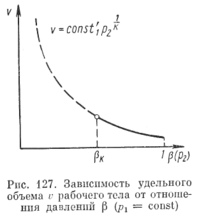 Уравнение (284) для расхода было бы справедливо, если бы газообразные тела были способны в надкритической сйласти расшириться в сопле от состояния, определяемого параметрами в сосуде p-i, Vi, до давления pz в окружающей среде; при этом удельный объем в устье сопла изменялся бы в зависимости от [3 по закону адиабаты (рис. 127).