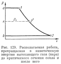 При истечении газа из суживающегося сопла при .условии, когда p2 < pk работоспособность потока будет в координатных осях р — v определяться площадью 12'ka (рис. 129). Если бы