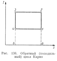 камера с помещенными в ней предметами, вторым — вода, взятая из естественных водоемов, или воздух. В соответствии с этим теоретически система, в которой осуществляется холодильный цикл, состоит из двух источников теплоты постоянных температур. В такой системе наиболее эффективным циклом является обратимый цикл Карно (рис. 136).