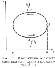 Общий вид обратного цикла показан на рис. 135. По нижней его ветви 1А2 от источников теплоты, которые в данном случае служат «менее нагретыми телами», к рабочему телу отводится теплота q2, которой соответствует площадка а1А2b. В процессе 2В1 (верхняя ветвь цикла) от рабочего тела отводится теплота q1, пред-