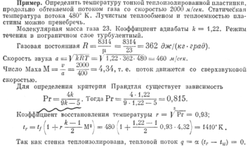 Пример. Определить температуру тонкой теплоизолированной пластинки, продольно обтекаемой потоком газа со скоростью 2000 м/сек. Статическая температура потока 480 К. Лучистым теплообменом и теплоемкостью пластины можно пренебречь.