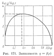 где В = А3,33 ; обе величины за-висят от рода жидкости и давления. Как показали эксперименты, с ростом давления значение qкр сначала резко увеличивается, достигает некоторого максимума, затем уменьшается и при критическом давлении становится равным нулю (рис. 171). По этим данным для воды наивысшее значение qкр ~ 4,6*103 кдж/(м2сек) должно быть при р ~ 80 бар (для воды ркр ~ 225 бар).