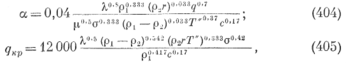 Для расчета теплоотдачи при объемном кипении чистых жидкостей в условиях свободной конвекции наиболее удачна обобщенная зависимость, полученная Г. П. Кружилиным. Формулы для расчета α и qкр в области пузырчатого кипения имеют вид