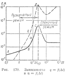 На рис. 170 даны типичные зависимости q = f (t) и α = f (t). В области АВ при малых значениях t значение коэффициента теплоотдачи невелико и определяется условиями сво- бодной конвекции жидкости. При увеличении t (участок BC) число возникающих пузырей возрастает, усиливается перемешива-