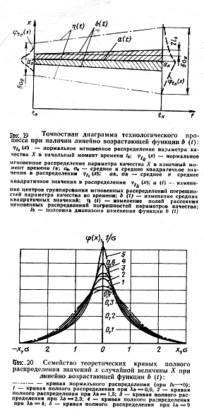 Представляет интерес рассмотрение схемы суммы, в состав которой также входит группа подчиненных условиям теоремы Ляпунова случайных слагаемых, число которых меняется в зависимости от какого либо аргумента t и средние значения равны нулю. В таком случае происходит изменение параметра рассеяния s случайной величины в зависимости от аргумента t. Если функция, описывающая это изменение, линейна, то точностная диаграмма процесса имеет вид, изображенный на рис. 19, полное распределение случайной величины представлено на рис. 20. Отличие полных распределений от закона Гаусса тем больше, чем больше соотношение lb=lb / so.