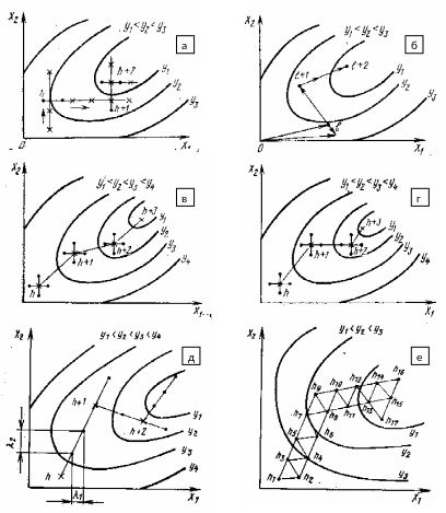 Рис.13. Поиск экстремумов функции отклика методами Гаусса-Зайделя (а), случайного поиска (б), градиента (в), Кифера-Вольфовица (г), крутого восхождения (д) и симплексным (е).