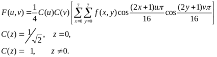 Дискретное косинусоидальное преобразование (DCT) превращает массив данных интенсивности в массив данных частоты, который содержит информацию о том, как быстро изменяется интенсивность. В JPEG применяется DCT для квадратов 8*8 данных о пикселях для каждого компонента цвета. Точки в каждом блоке нумеруются от (0,0) в верхнем левом до (7,7) в нижнем правом углах. F(x,y) есть значение данных в точке (x,y). Создаётся новый блок по формуле: