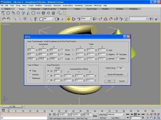 Команда Array (Массив) вызывается из списка кнопок, расположенных на панели инструментов Axis Constraints (Ограничения осей). Одноименное диалоговое окно Array позволяет задать способ копирования, размерность массива (1,2 или 3D), а также вид трансформации (Move, Rotate или Scale) которая будет применена к каждой копии .