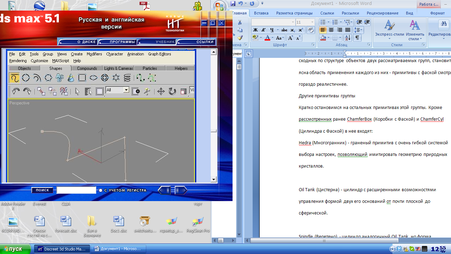 Расширенные Примитивы. ChamferBox (Коробка с Фаской), ChamferCyl (Цилиндр с Фаской) Набор стандартных примитивов дополняется и расширяется при использовании следующей группы базовых объектов геометрии Мах -Extended Primitives (Расширенных Примитивов). При создании таких объектов из первой группы примитивов Мах как Box (Коробка) или Cylinder (Цилиндр. ChamferBox (Коробка с Фаской) и ChamferCyl (Цилиндр с Фаской). Список параметров этих примитивов полностью совпадает с соответствующими им стандартными объектами, за исключением новых счетчиков Fillet (Фаска) и Fillet Segs (Число Сегментов Фаски). Разберем их назначение и действие.