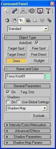 Target Spot (Нацеленный Прожектор) - источник света, состоящий из собственно излучателя и Target (Точки Цели), задающей направление лучей. Такой осветитель можно представить в виде конуса или пирамиды с вершиной в точке излучения. В видовых окнах осветитель отрисовывается как желтая восьмигранная пирамидка (излучатель), соединенная голубой линией (осью луча зрения) с желтым кубиком (точкой цели)