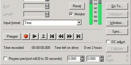 10. Начните воспроизводить материал, который вы хотите записать. Во время записи индикатор Time recorded показывает, сколько прошло времени с начала записи; индикатор Time left on drive показывает, сколько пространства осталось на вашем жестком диске, в формате часы: минуты : секунды : миллисекунды. Вы можете изменить формат для обоих индикаторов, выбрав другой пункт из раскрывающегося списка Input format.