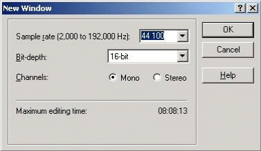 1. Создайте новый звуковой файл, выбрав пункт New в меню File, чтобы открыть диалоговое окно New Window.
