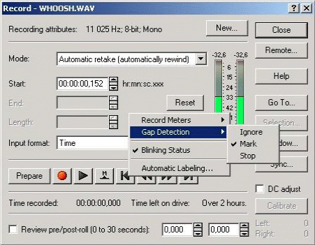 Sound Forge не предоставляет средств для многодорожечной записи и воспроизведения. Главное его предназначение - редактирование. Предварительные параметры. Среди таких параметров - свойства записи, регулировка смещения по оси амплитуды и выявление промежутка в записи. Все перечисленные параметры можно отрегулировать с помощью диалогового окна Record.
