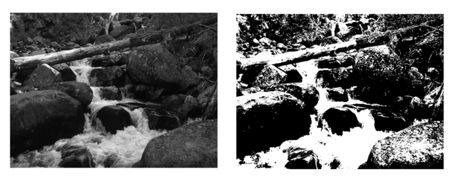Преобразование с пороговой характеристикой (рис.а) превращает полутоновое изображение, содержащее все уровни яркости, в бинарное, точки которого имеют яркости 0 или y=ymax. Такая операция, называемая иногда бинаризацией или бинарным квантованием, может быть полезной, когда для наблюдателя важны очертания объектов, присутствующих на изображении,