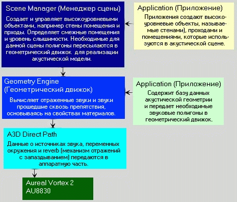 Существуют три главных компонента: интерфейс A3D, geometry engine (геометрический движок, определяющий геометрию объектов в пространстве) и scene manager (менеджер сцены). Интерфейс A3D является основным компонентом. Один в отдельности он используется для реализации прямых путей распространения звука (direct path). Geometry engine является основным компонентом для обсчета отраженных и прошедших сквозь препятствия акустических звуковых волн или для Acoustic Wavetracing. Менеджер сцены используется как геометрическим движком, так и интерфейсом A3D для управления сложными звуковыми сценами. Обработка каждого из этих компонентов будет производиться именно в таком порядке. Взаимосвязь и функционирование менеджера сцены, геометрического движка и реализация прямых путей распространения звука показаны ниже: