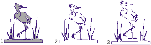 Рис. 5. 1 – исходное изображение, 2 – рисунок (как совокупность векторов), 3 – разгруппированный рисунок в виде набора контуров, 4 - представление рисунка в виде сегментов, состоящих из узлов и отрезков, модификация рисунка путём изменения положения узлов и управляющих точек, 5 – однотонная заливка.